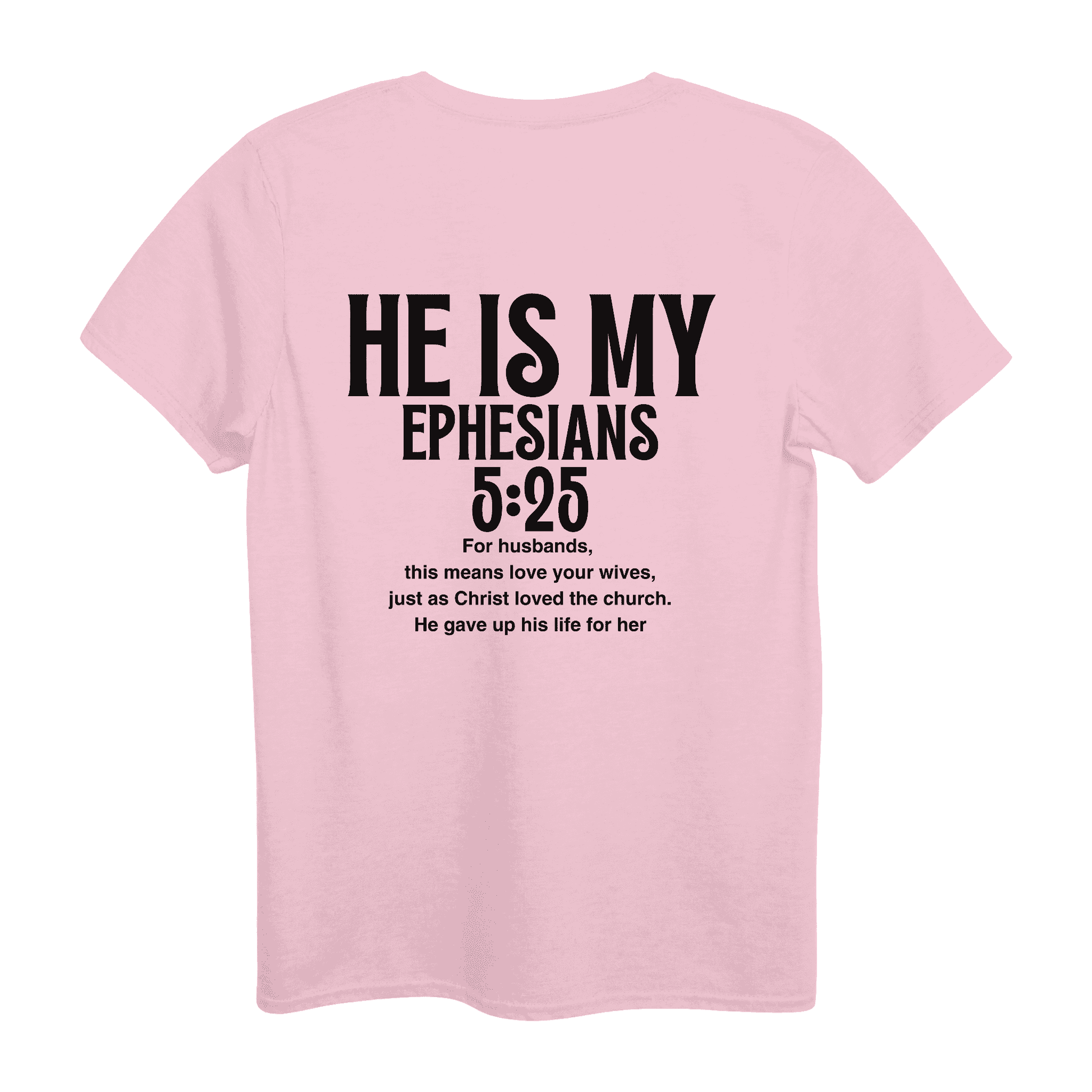 This pink women’s T-shirt is part of a beautiful couples set designed to celebrate love, faith, and commitment. Featuring the message “He Is My Ephesians 5:25,” it honors a love rooted in sacrifice, care, and devotion—reflecting the biblical call to love deeply and selflessly.